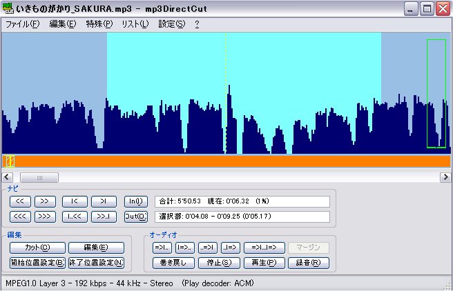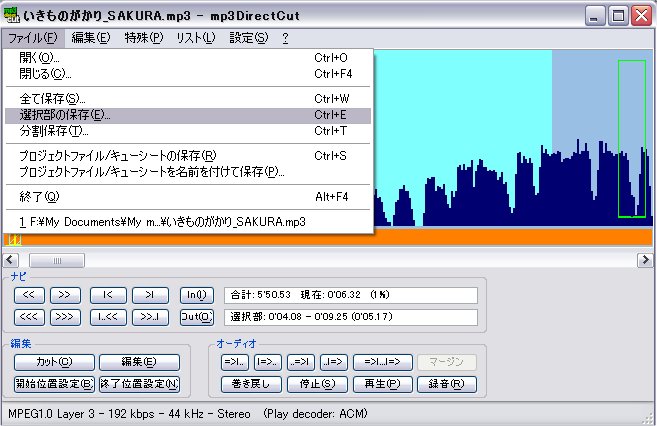 そこでソフトを使って着信音にしたい曲のパーツを切り取る作業をします。今回使うソフトは”mp3DirectCut”というフリーソフトです。 ここ からダウンロード出来ます。(インストール手順は省略いたします。)